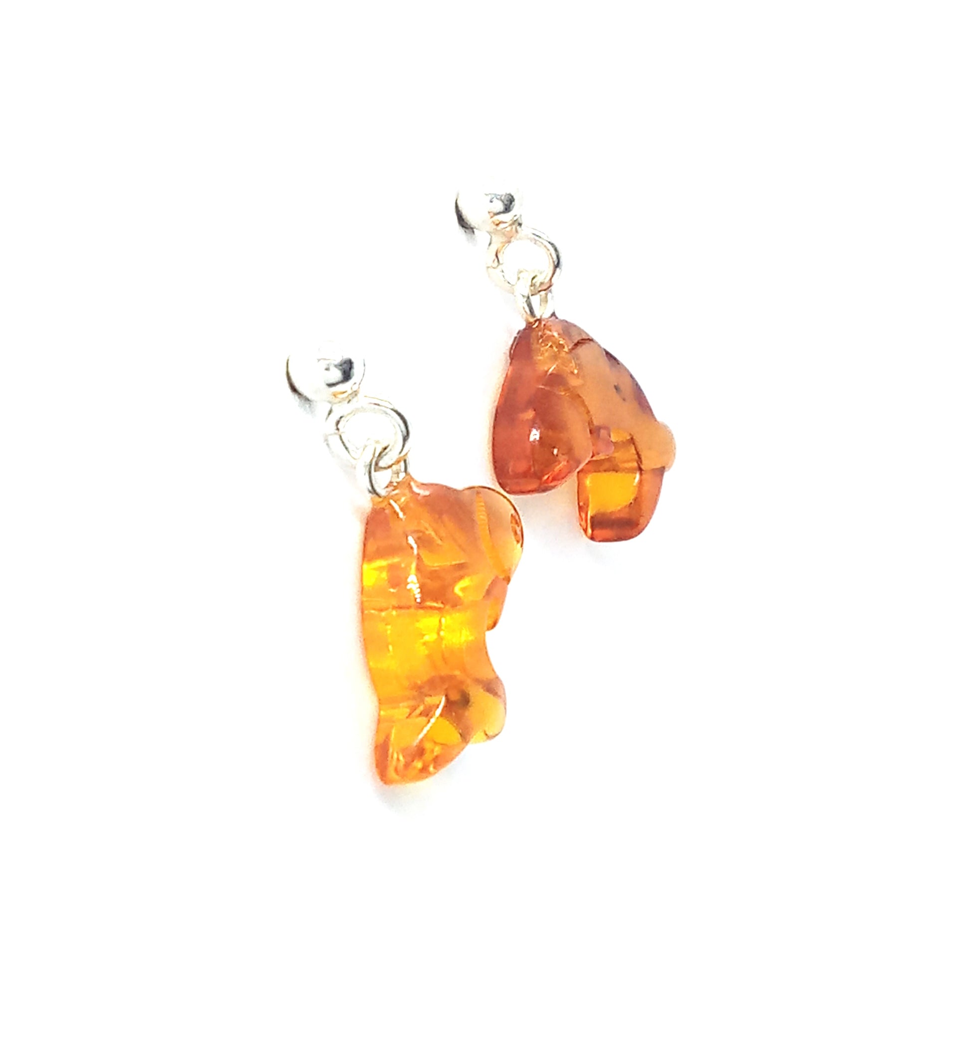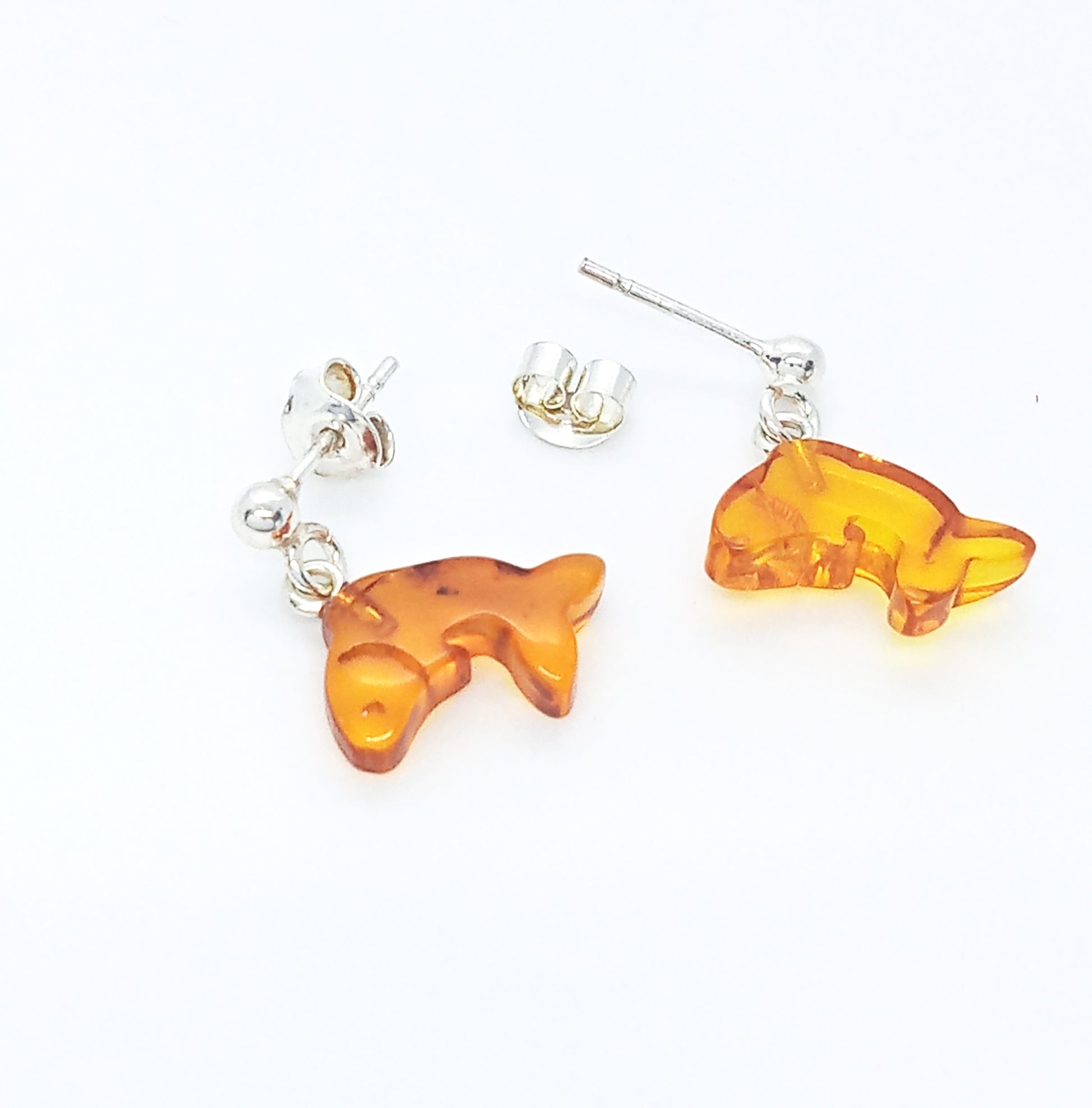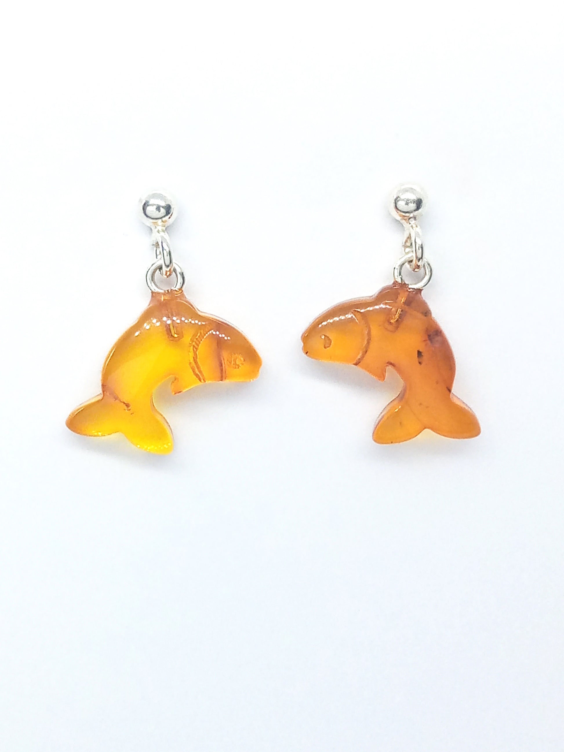 ARETES COLGANTES DE POSTE CON ÁMBAR TALLADO EN FORMA DE PEZ