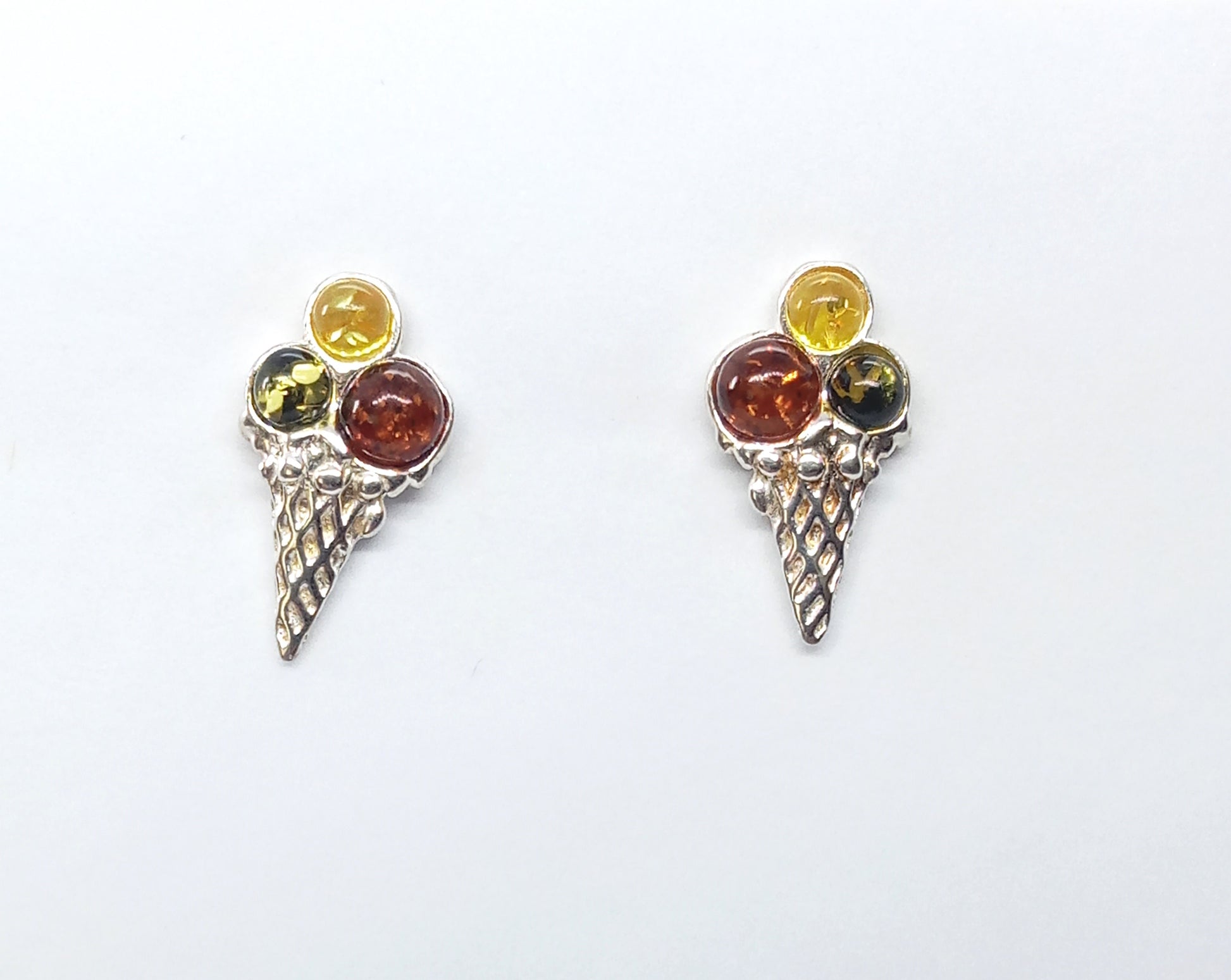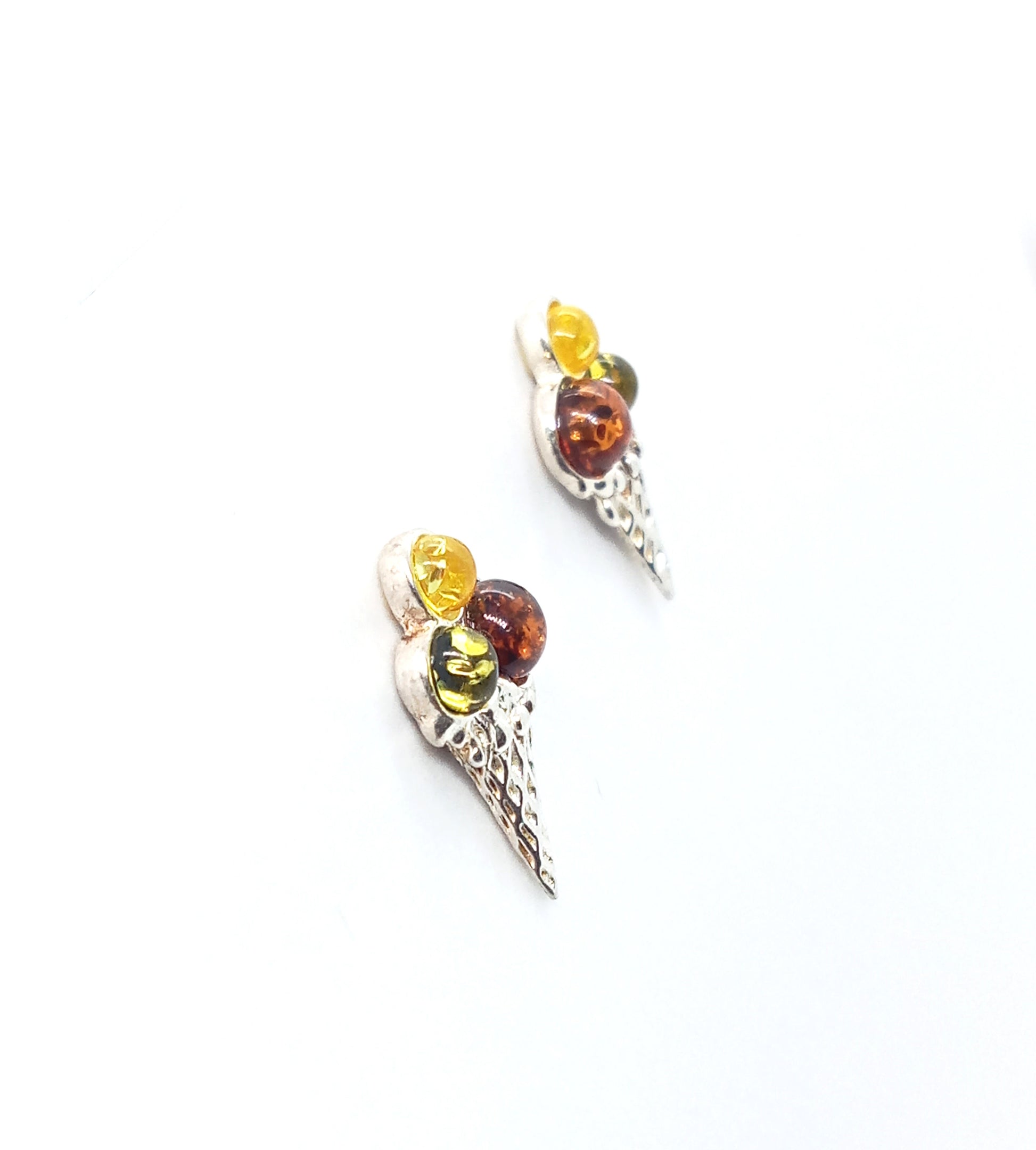 ARETES PEGADOS DE POSTE CON TRES BOLAS DE ÁMBAR Y PLATA EN DISEÑO DE CONO DE HELADO