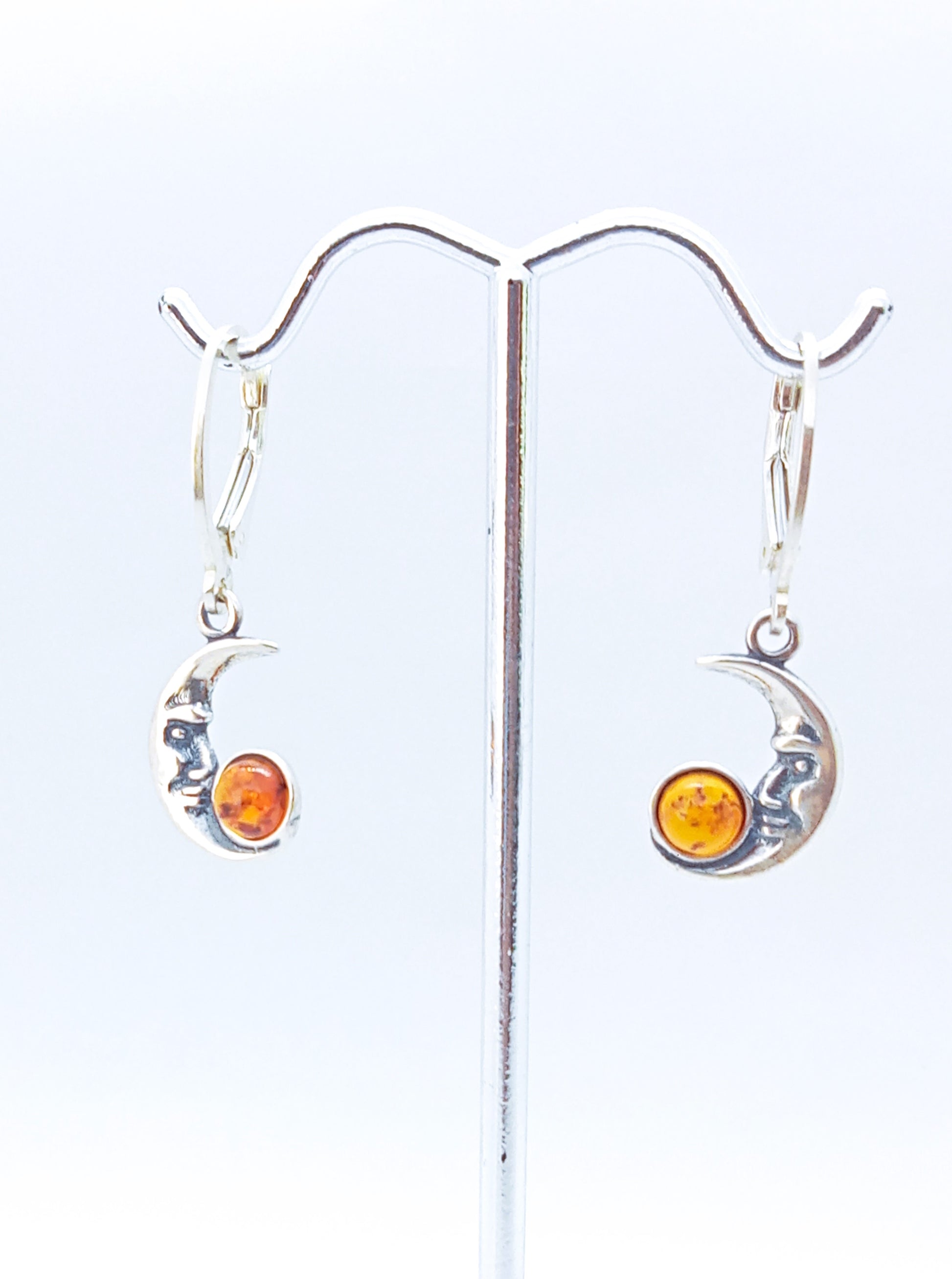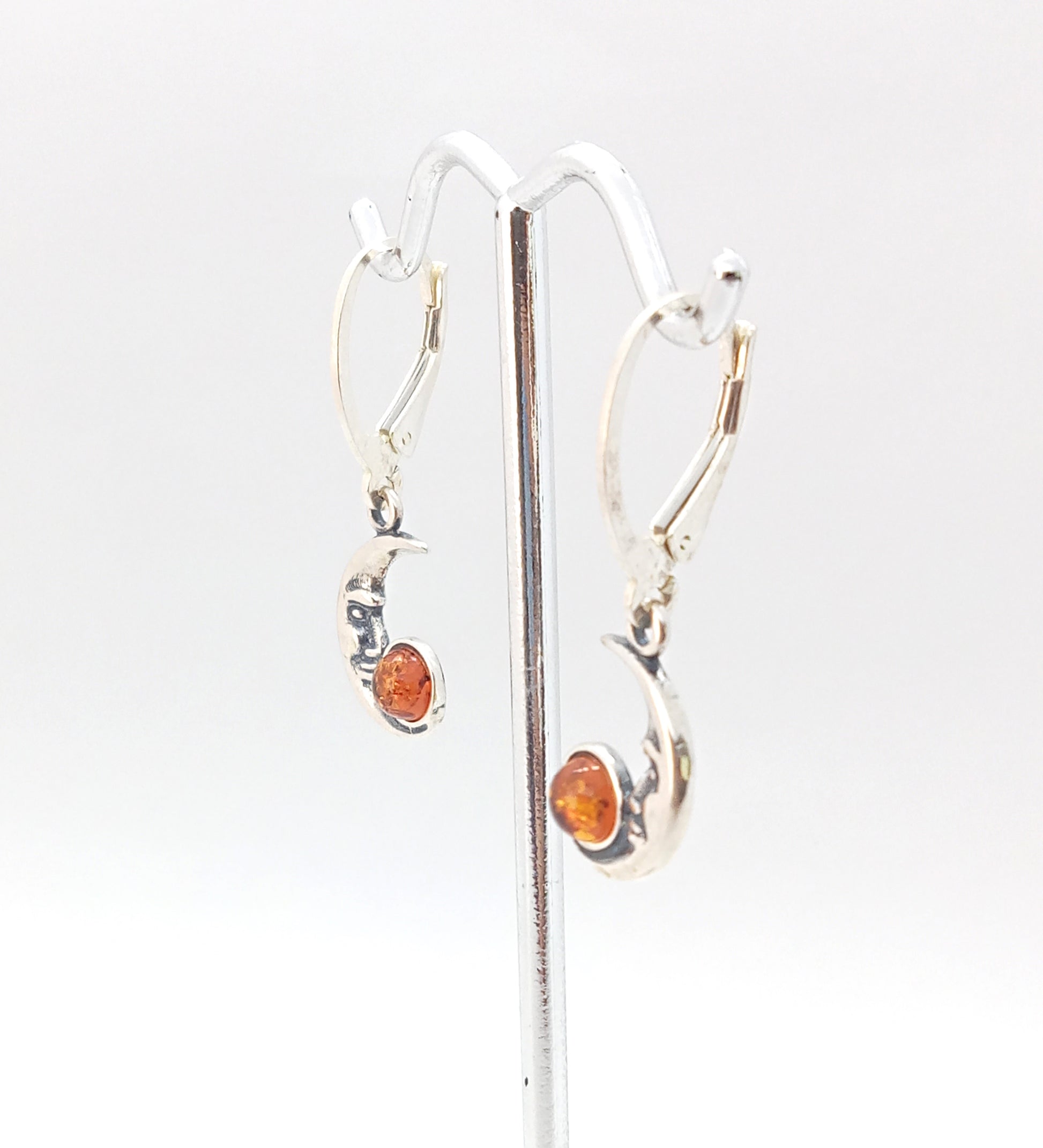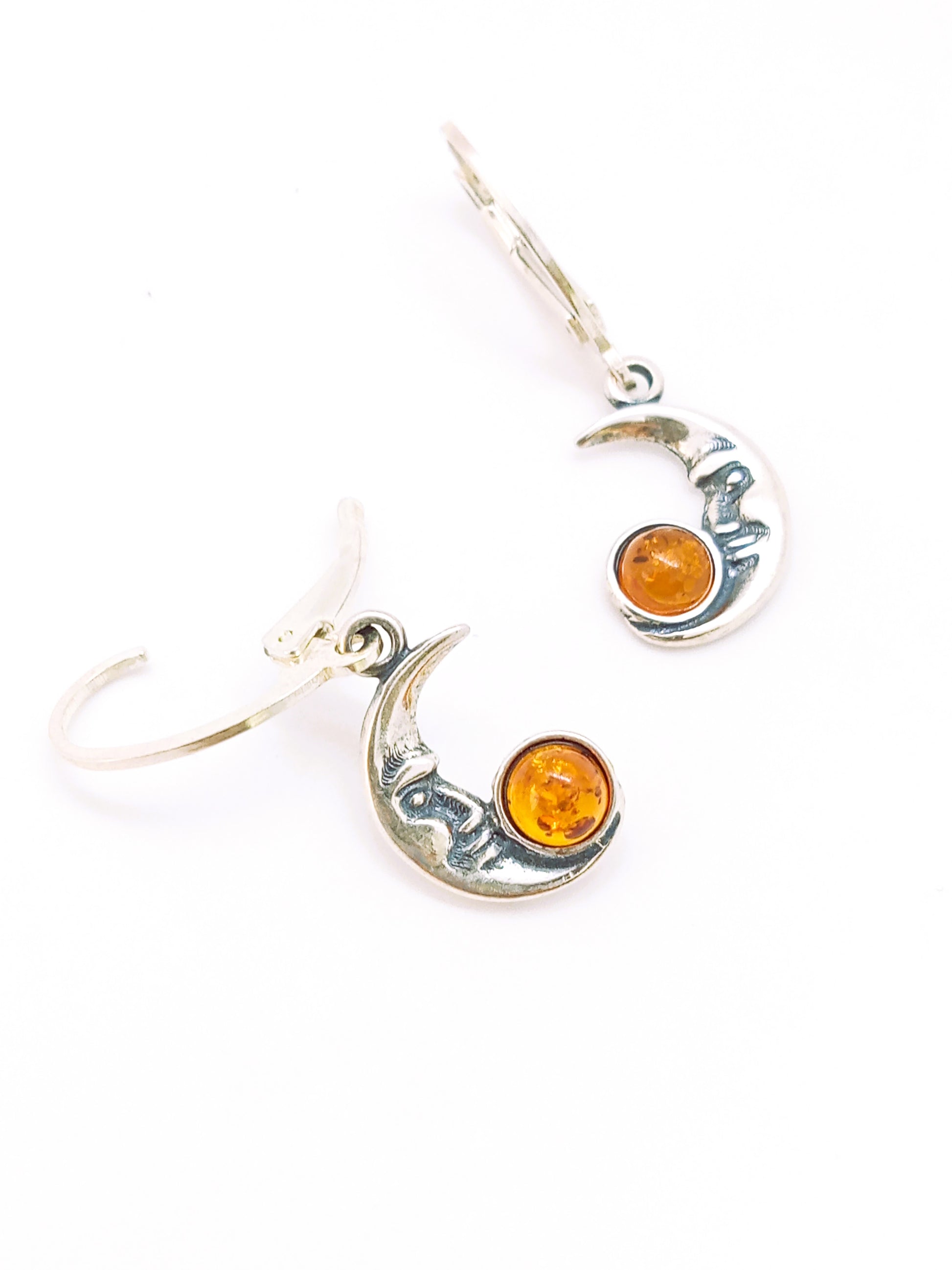 ARETES COLGANTES DE GANCHO CON LUNA DE PLATA Y ÁMBAR CIRCULAR
