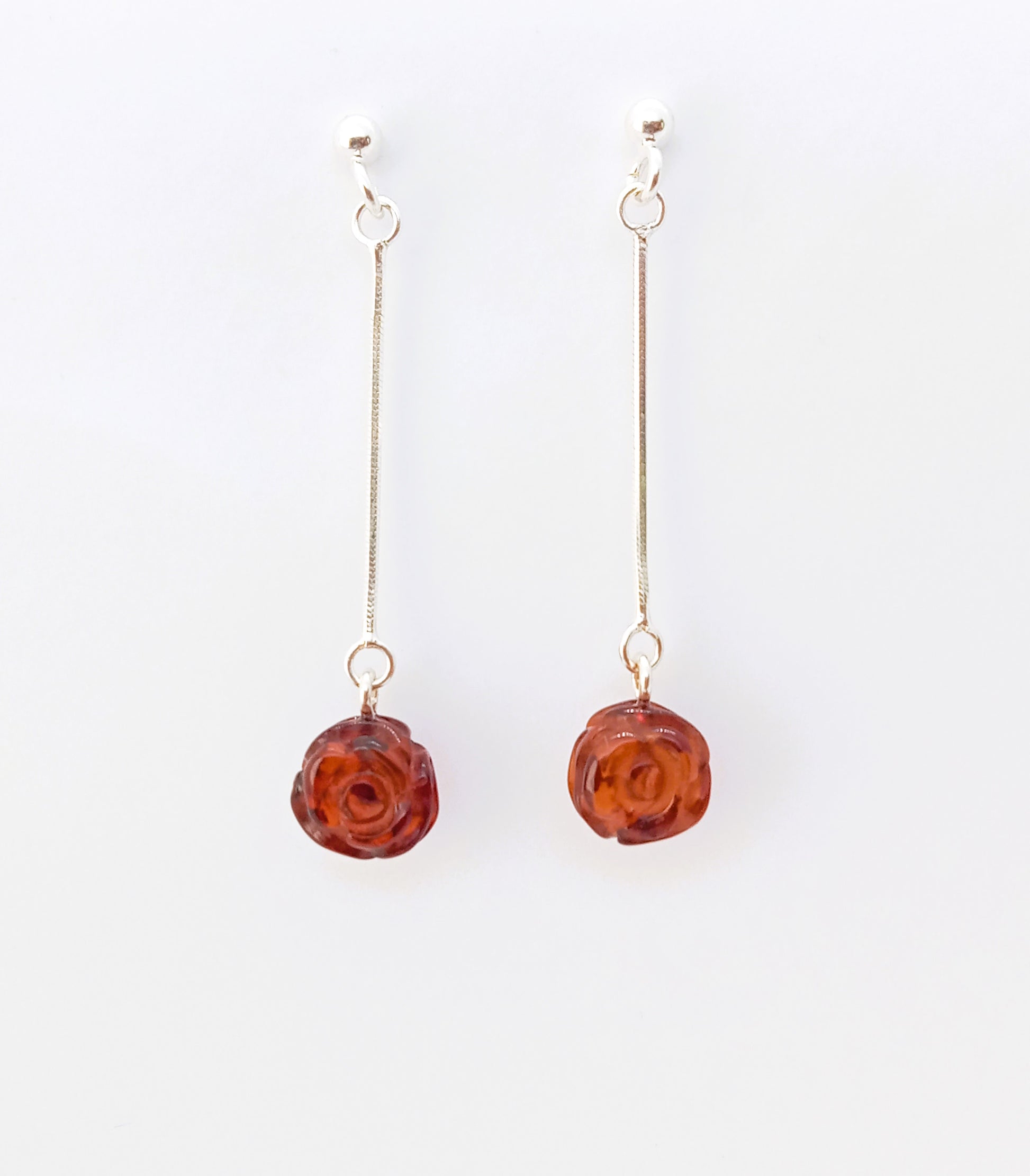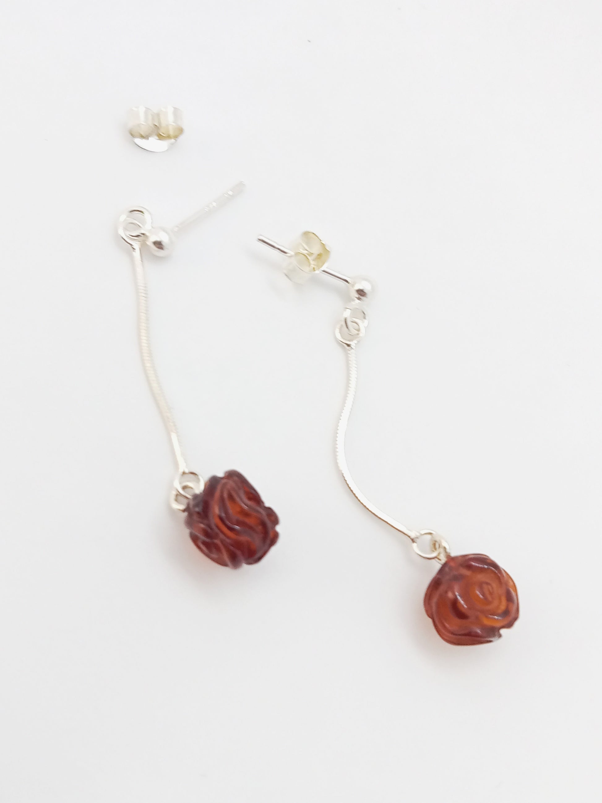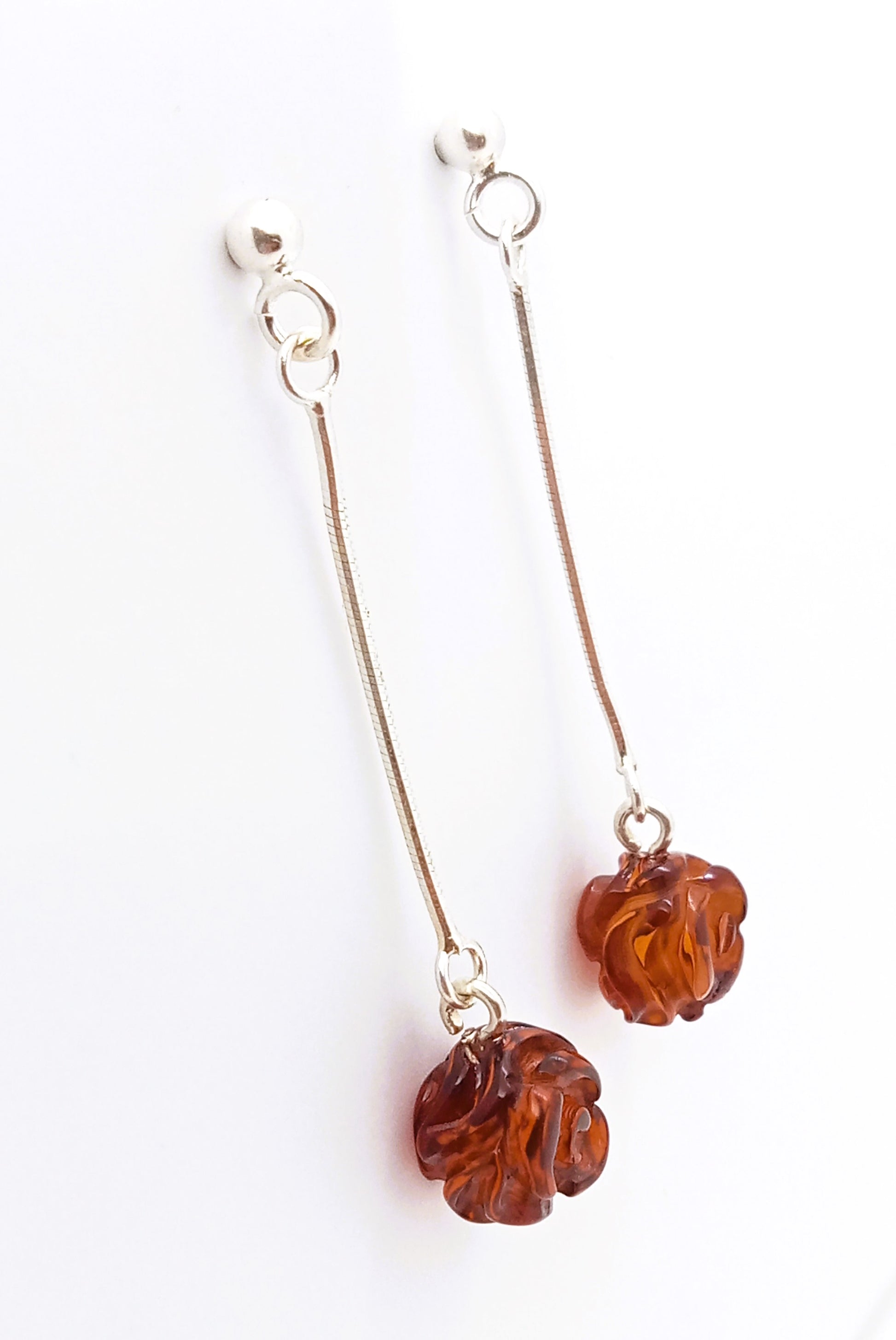 ARETES COLGANTES DE POSTE CON CADENA COLA DE RATA Y ÁMBAR TALLADO EN FORMA DE ROSA