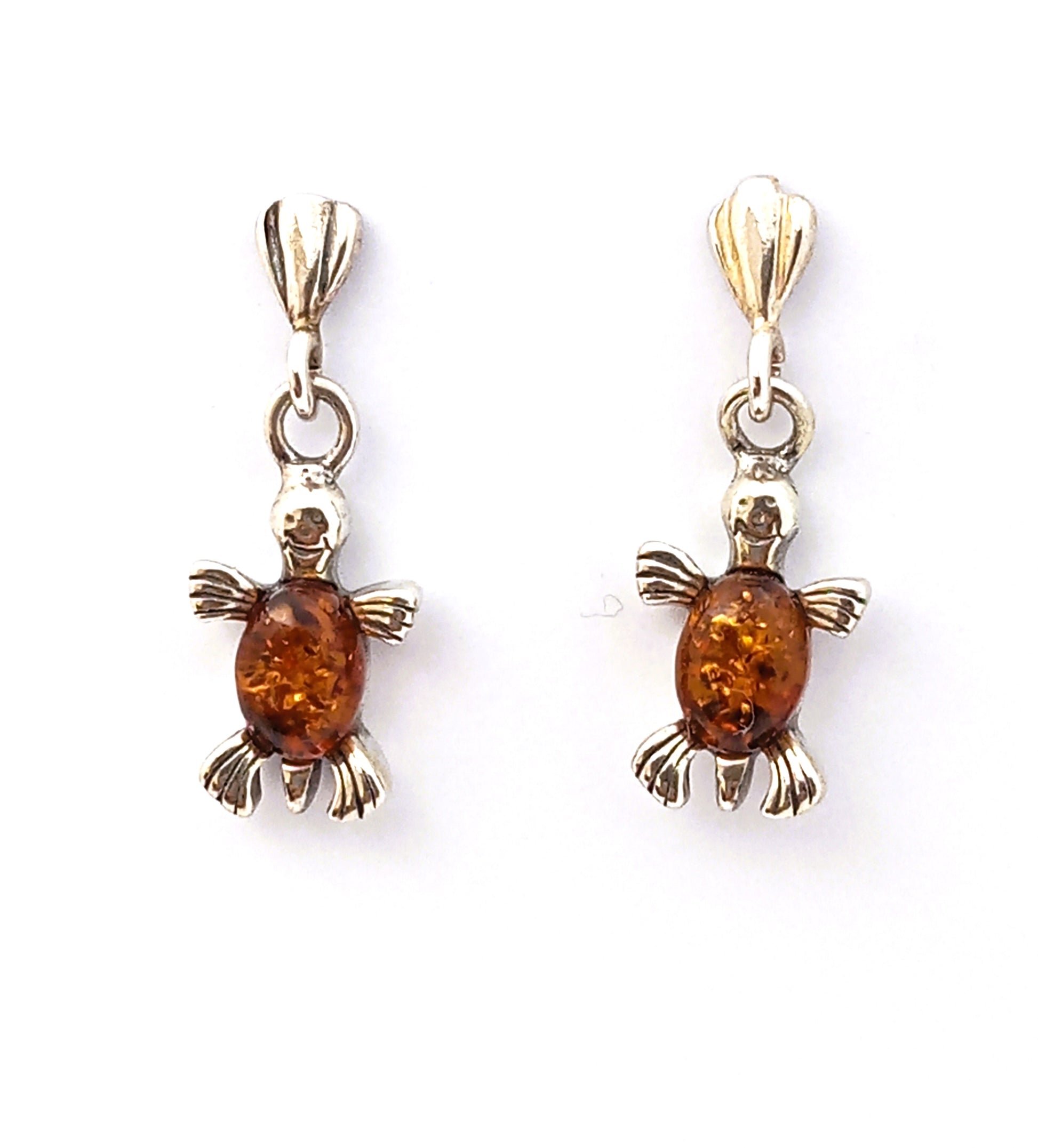 ARETES COLGANTES DE POSTE CON TORTUGUITA DE PLATA Y ÁMBAR OVALADO