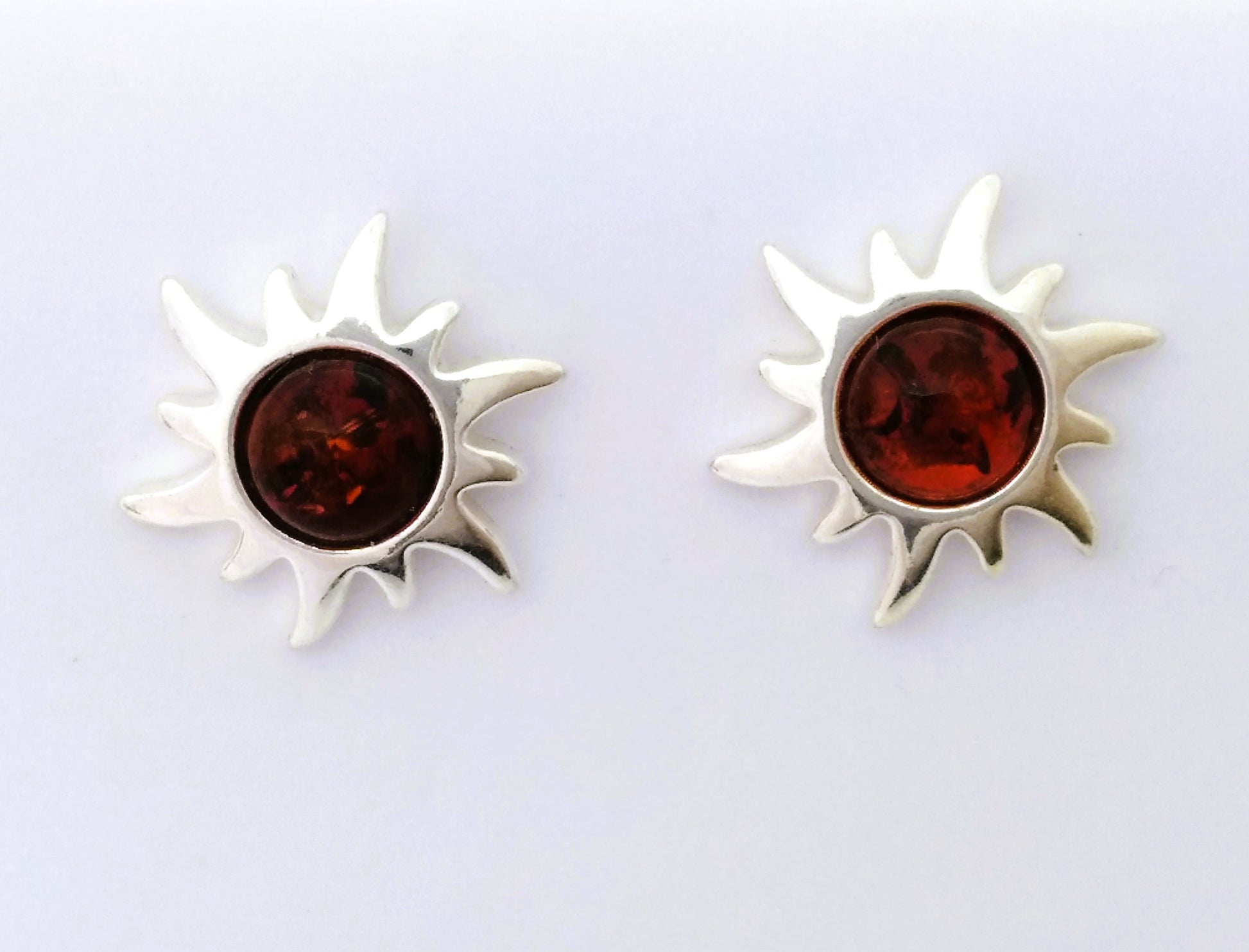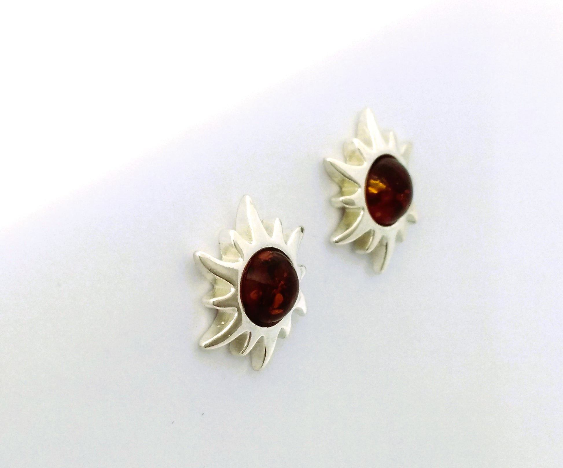 ARETES PEGADOS DE POSTE CON ÁMBAR CIRCULAR Y BISEL DE PLATA EN FORMA DE SOL