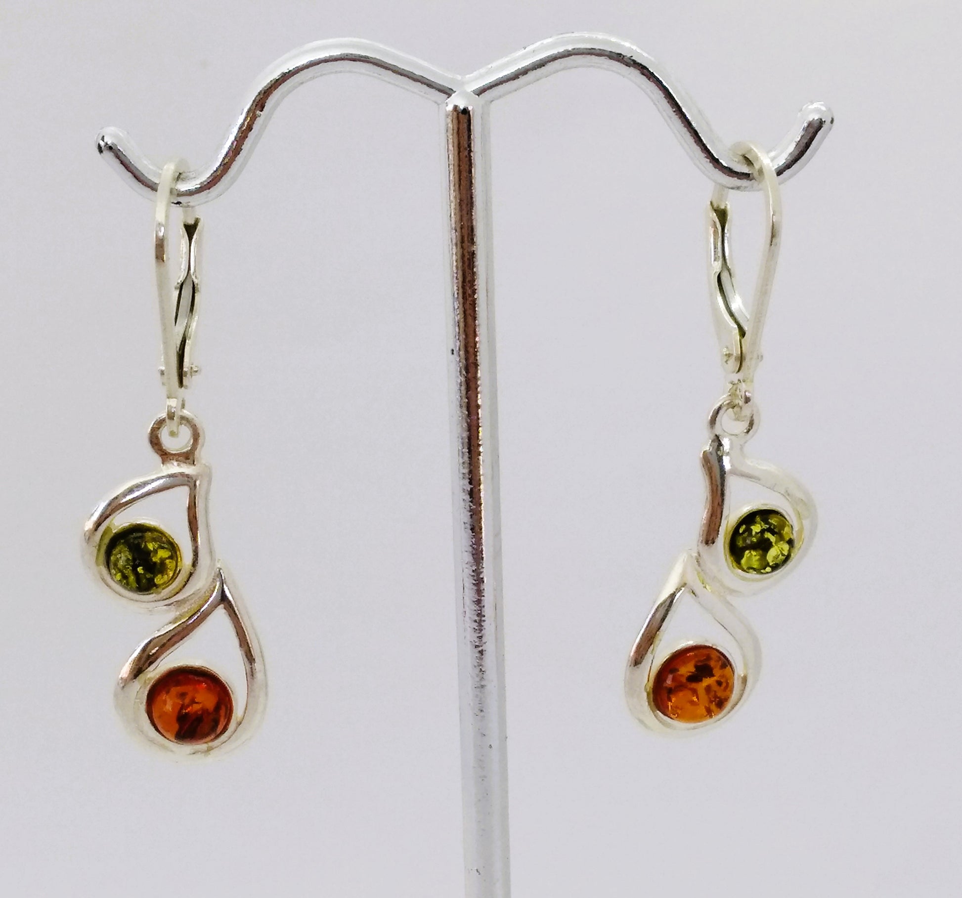 ARETES COLGANTES DE GANCHO CON DOS PIEDRAS DE ÁMBAR CIRCULAR DE DIFERENTE COLOR Y TAMAÑO